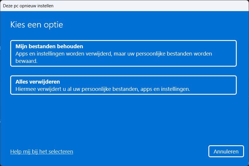 Avec « tout supprimer », vous réinitialisez complètement votre PC, pensez à l’installation propre de l’introduction. Windows est réinstallé et tous vos fichiers personnels, applications et paramètres sont supprimés. C’est pratique si vous voulez par exemple vendre votre PC.